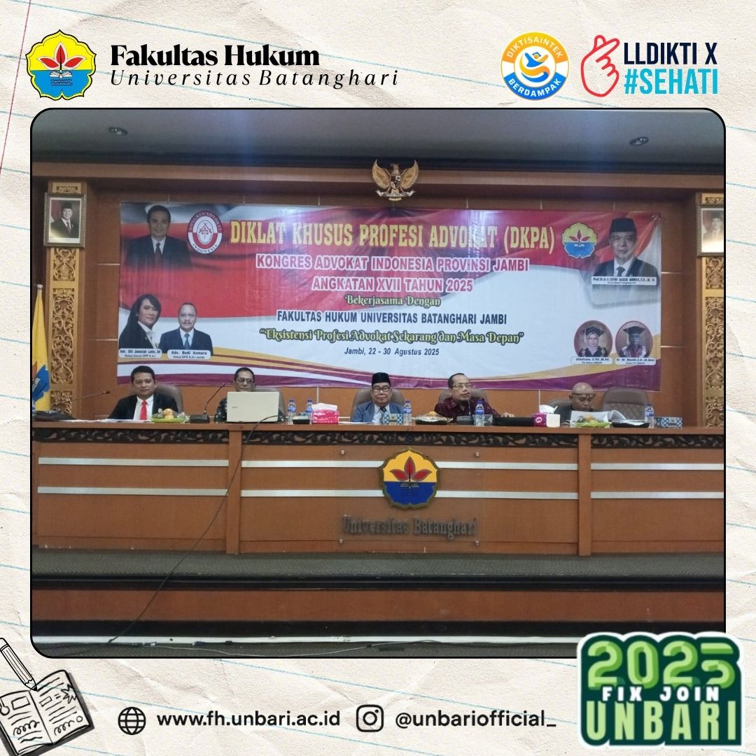 Jambi, 2025 – Dosen dan mahasiswa Fakultas Hukum Universitas Batanghari (UNBARI) berpartisipasi dalam Seminar Peringatan Hari Lahir Kejaksaan RI ke-80 yang diselenggarakan oleh Kejaksaan Tinggi Jambi di Universitas Jambi. Seminar ini mengusung tema “Optimalisasi Pendekatan Follow the Asset dan Follow the Money melalui Deferred Prosecution Agreement dalam Penanganan Perkara Pidana” dengan menghadirkan Kepala Kejaksaan Tinggi...Read More