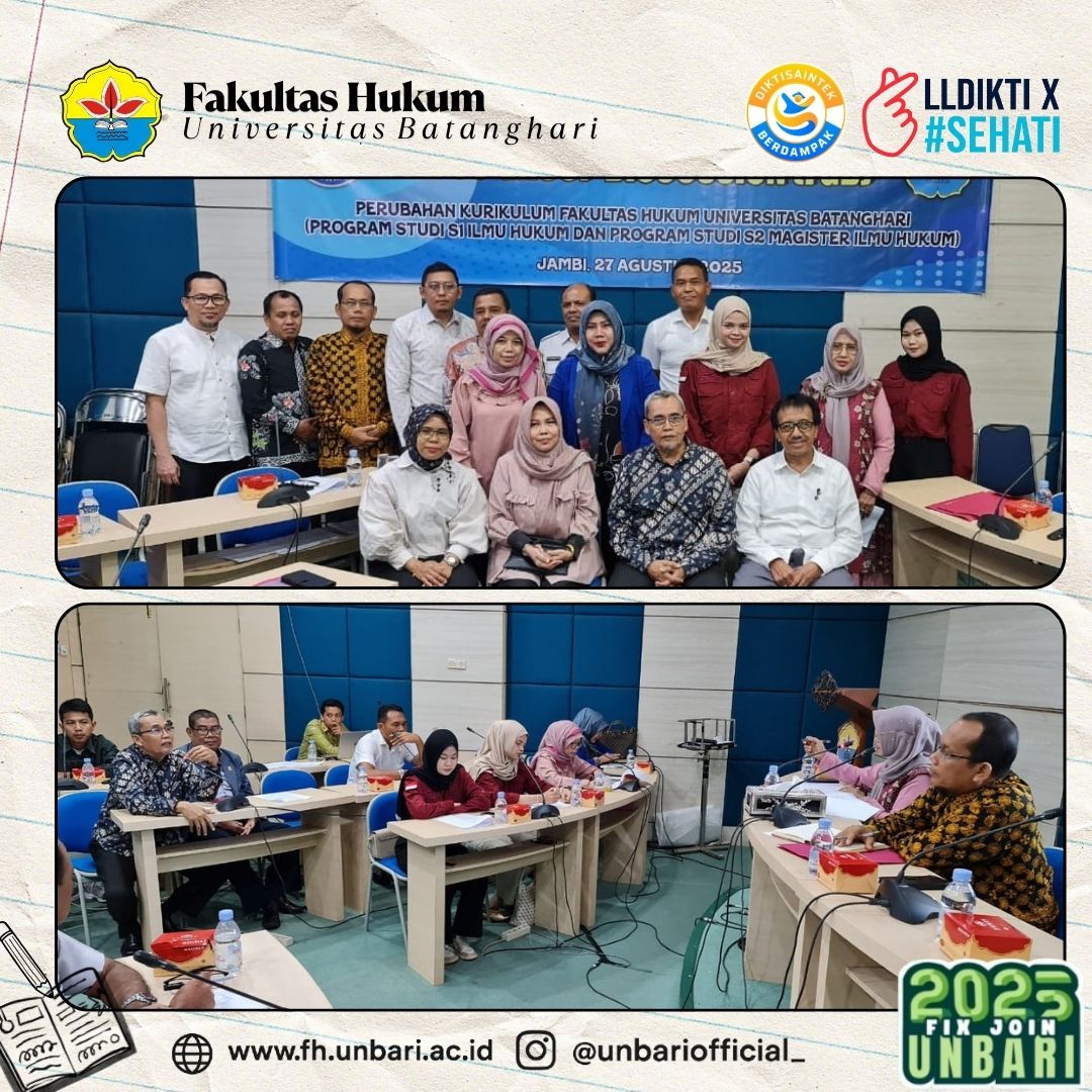 Jambi, 2025 – Fakultas Hukum Universitas Batanghari (UNBARI) mengadakan Focus Group Discussion (FGD) sebagai langkah strategis dalam merancang perubahan kurikulum Program Studi S1 Ilmu Hukum dan S2 Magister Ilmu Hukum. Agenda ini menjadi momentum penting untuk memperkuat mutu pendidikan hukum di UNBARI agar selaras dengan dinamika ilmu pengetahuan, kebutuhan pasar kerja, serta regulasi pendidikan tinggi...Read More