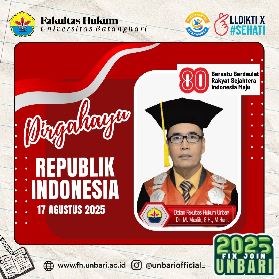 Jambi – Fakultas Hukum Universitas Batanghari (FH Unbari) menyampaikan ucapan selamat memperingati Hari Ulang Tahun ke-80 Kemerdekaan Republik Indonesia pada 17 Agustus 2025. Dengan mengusung tema nasional “Bersatu, Berdaulat, Rakyat Sejahtera, Indonesia Maju”, peringatan HUT RI tahun ini menjadi momentum penting untuk meneguhkan semangat persatuan bangsa, memperkuat kedaulatan negara, serta mengupayakan kesejahteraan rakyat menuju Indonesia...Read More