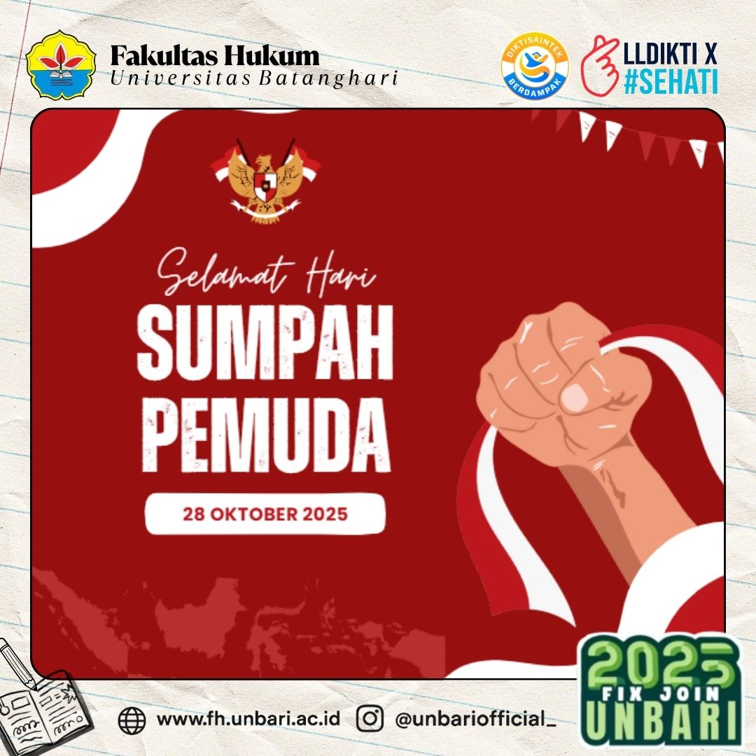 Dekan dan Seluruh Sivitas Fakultas Hukum Universitas Batanghari menyampaikan ucapan Selamat Hari Sumpah Pemuda ke-96, yang diperingati pada 28 Oktober 2025. Momen bersejarah ini menjadi pengingat penting akan tekad para pemuda tahun 1928 dalam memperkuat persatuan dan membangun jati diri bangsa. Semangat Sumpah Pemuda menginspirasi Fakultas Hukum untuk terus berkomitmen dalam penegakan hukum, penguatan karakter,...Read More