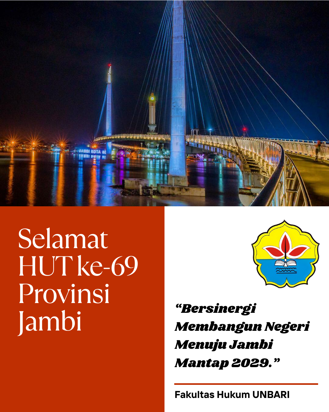 Jambi, 06 Januari 2026 – Dekan bersama seluruh Sivitas Akademika Fakultas Hukum Universitas Batanghari (FH UNBARI) menyampaikan ucapan selamat atas peringatan Hari Ulang Tahun (HUT) ke-69 Provinsi Jambi yang mengangkat tema “Bersinergi Membangun Negeri Menuju Jambi Mantap 2029.” Tema tersebut merefleksikan semangat kolaborasi dan kebersamaan antara pemerintah daerah, masyarakat, serta seluruh elemen pembangunan dalam mewujudkan...Read More