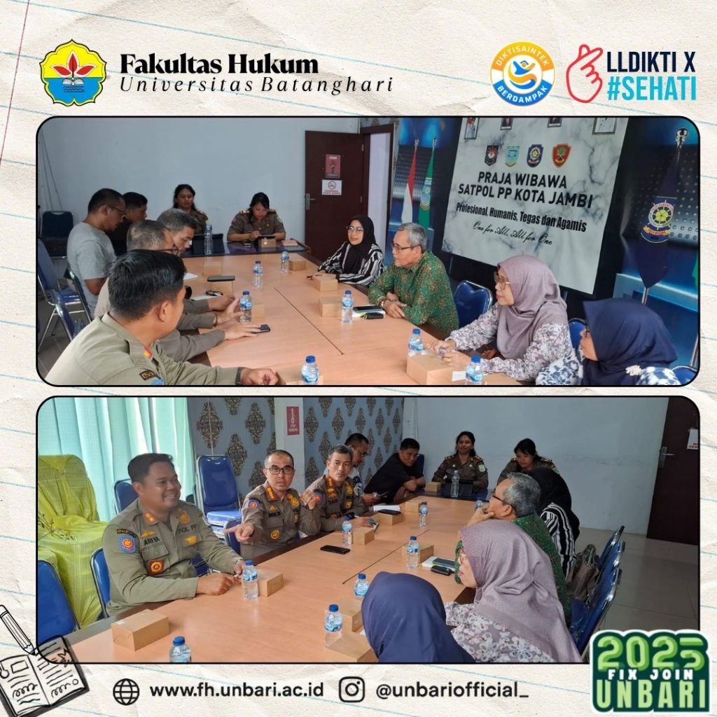 Jambi, 11 November 2025 Fakultas Hukum Universitas Batanghari (Unbari) bersama Satuan Polisi Pamong Praja (Satpol PP) Kota Jambi menggelar rapat kerja dalam rangka penyusunan Naskah Akademik dan Rancangan Peraturan Daerah (Ranperda) tentang Penyelenggaraan Ketenteraman, Ketertiban Umum, dan Perlindungan Masyarakat.