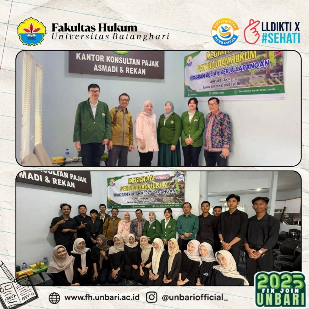 Jambi, 13 November 2025 — Mahasiswa Fakultas Hukum Universitas Batanghari melaksanakan kegiatan Penyuluhan Hukum sebagai bagian dari Program Kuliah Kerja Lapangan (KKL) Semester Ganjil Tahun Akademik 2025–2026. Kegiatan ini dilangsungkan di Kantor Konsultan Pajak Asmadi & Rekan (KKPA), salah satu lembaga profesional yang bergerak di bidang konsultasi perpajakan di Kota Jambi.
