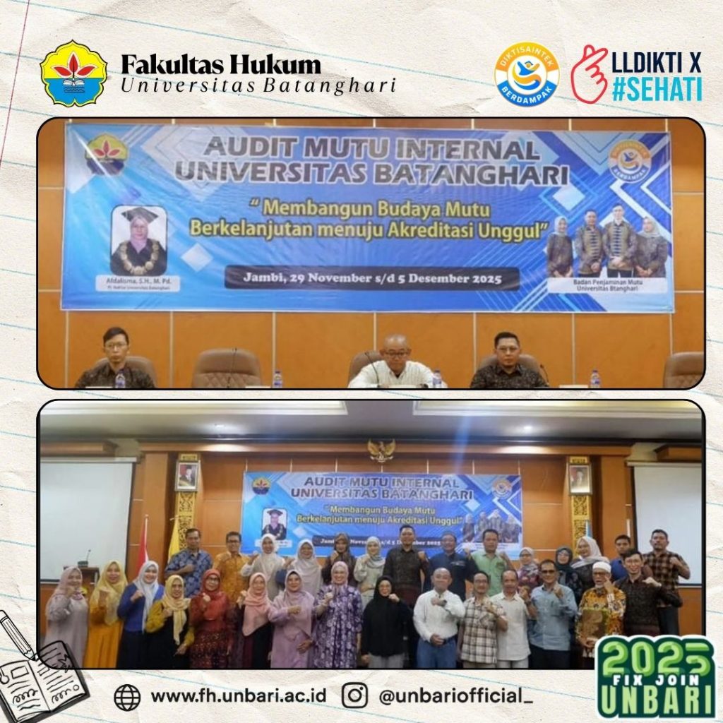 Jambi, 29 November 2025 – Fakultas Hukum Universitas Batanghari (UNBARI) turut berpartisipasi dalam rangkaian Pembukaan Pelaksanaan Audit Mutu Internal (AMI) Universitas Batanghari Tahun 2025 yang mengusung tema “Membangun Budaya Mutu Berkelanjutan Menuju Akreditasi Unggul.” Kegiatan ini menjadi langkah strategis dalam memperkuat komitmen fakultas terhadap peningkatan mutu pendidikan tinggi.