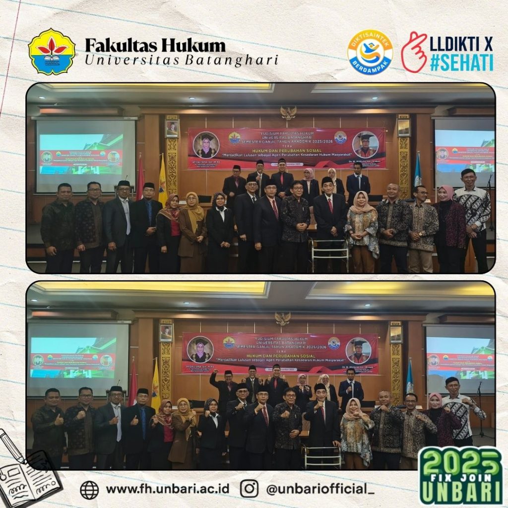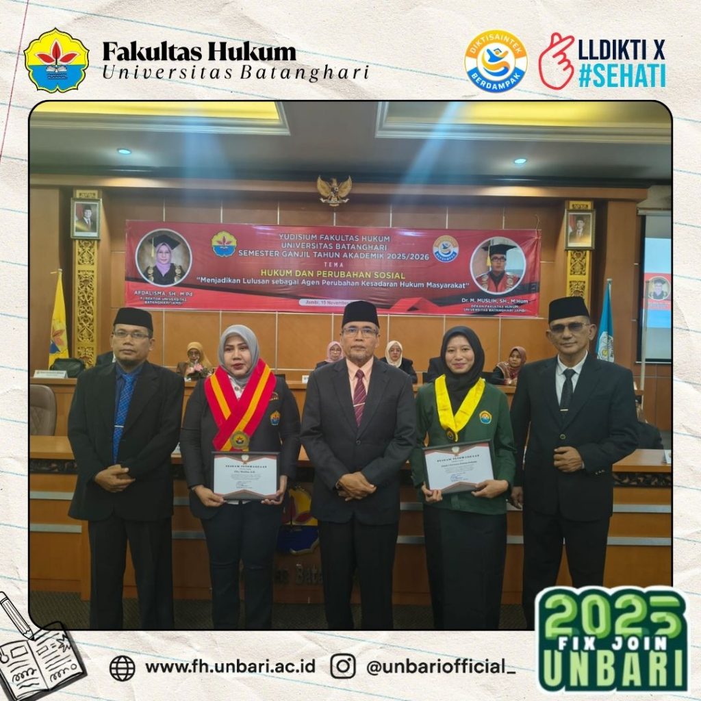 Jambi, 15 November 2025 Fakultas Hukum Universitas Batanghari telah melaksanakan Yudisium Ke-XI Semester Ganjil Tahun Akademik 2025/2026 dengan tema Hukum dan Perubahan Sosial “Menjadikan Lulusan Sebagai Agen Perubahan Kesadaran Hukum Masyarakat” di Aula H. Abdurrahman Sayuti